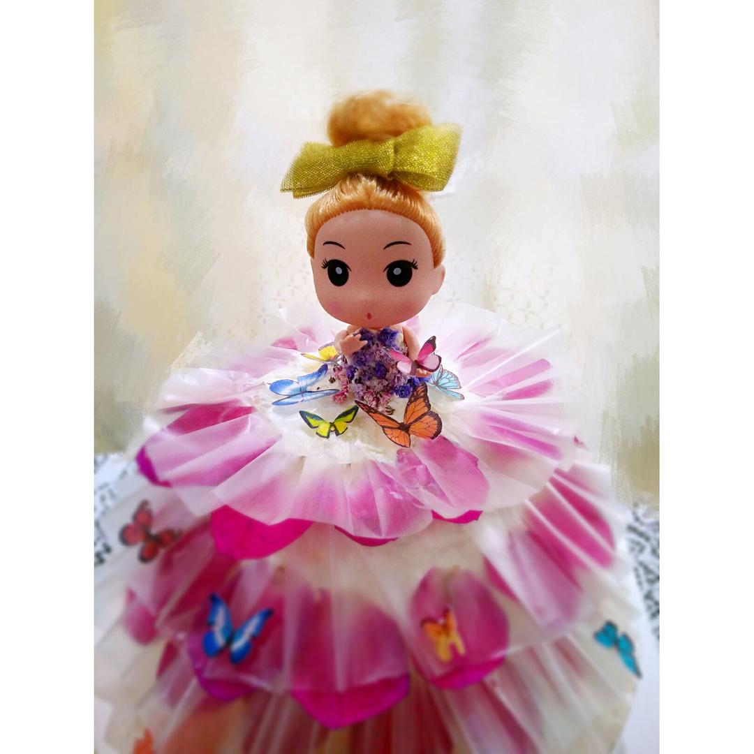 第一个芭比娃娃,不想用色素,就用了苏打水洗过的玫瑰花瓣,和一些糯米纸蝴蝶做了色...