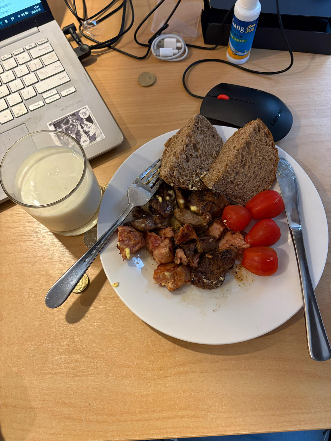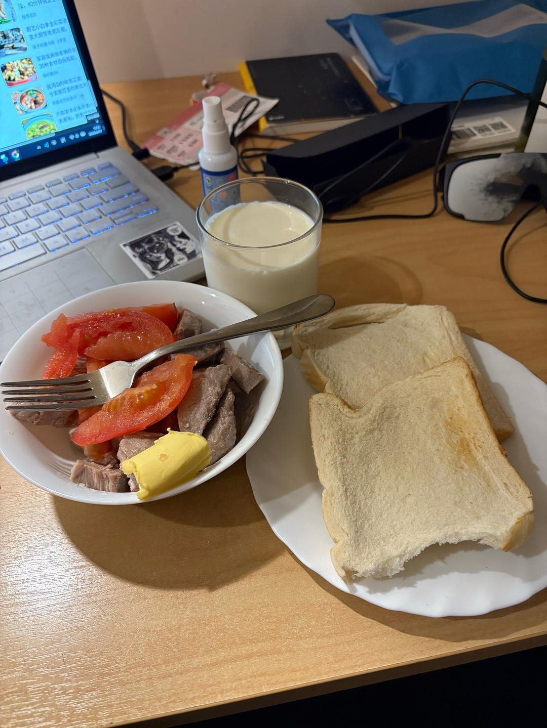 葡萄酒煎羊肉+煎午餐肉+黄油+小番茄+2黑麦粗面包+牛奶