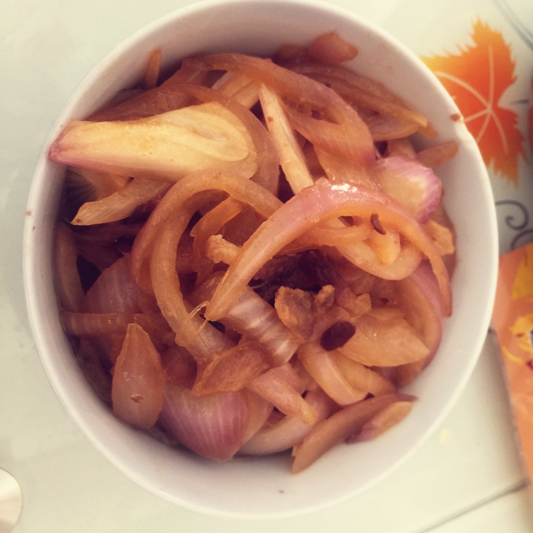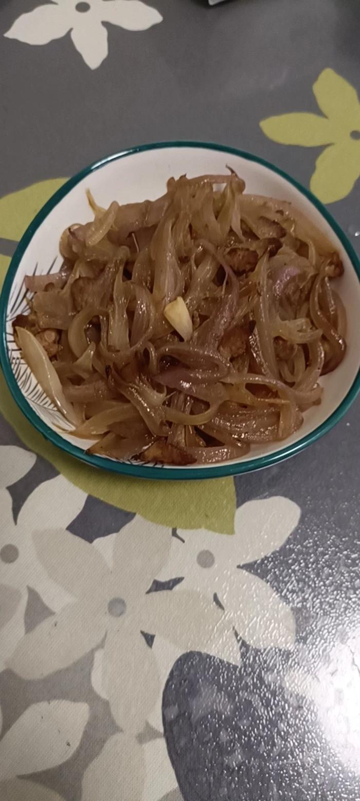第二步另加油放入洋葱炒。少量的生抽和水。