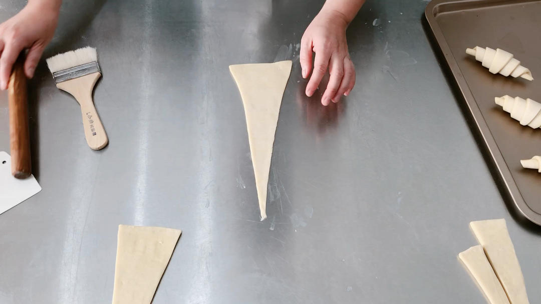 早安。每日分享面包日常分享。翻出牛角整形的视频,牛角整形手速要快,面皮不要粘很多粉