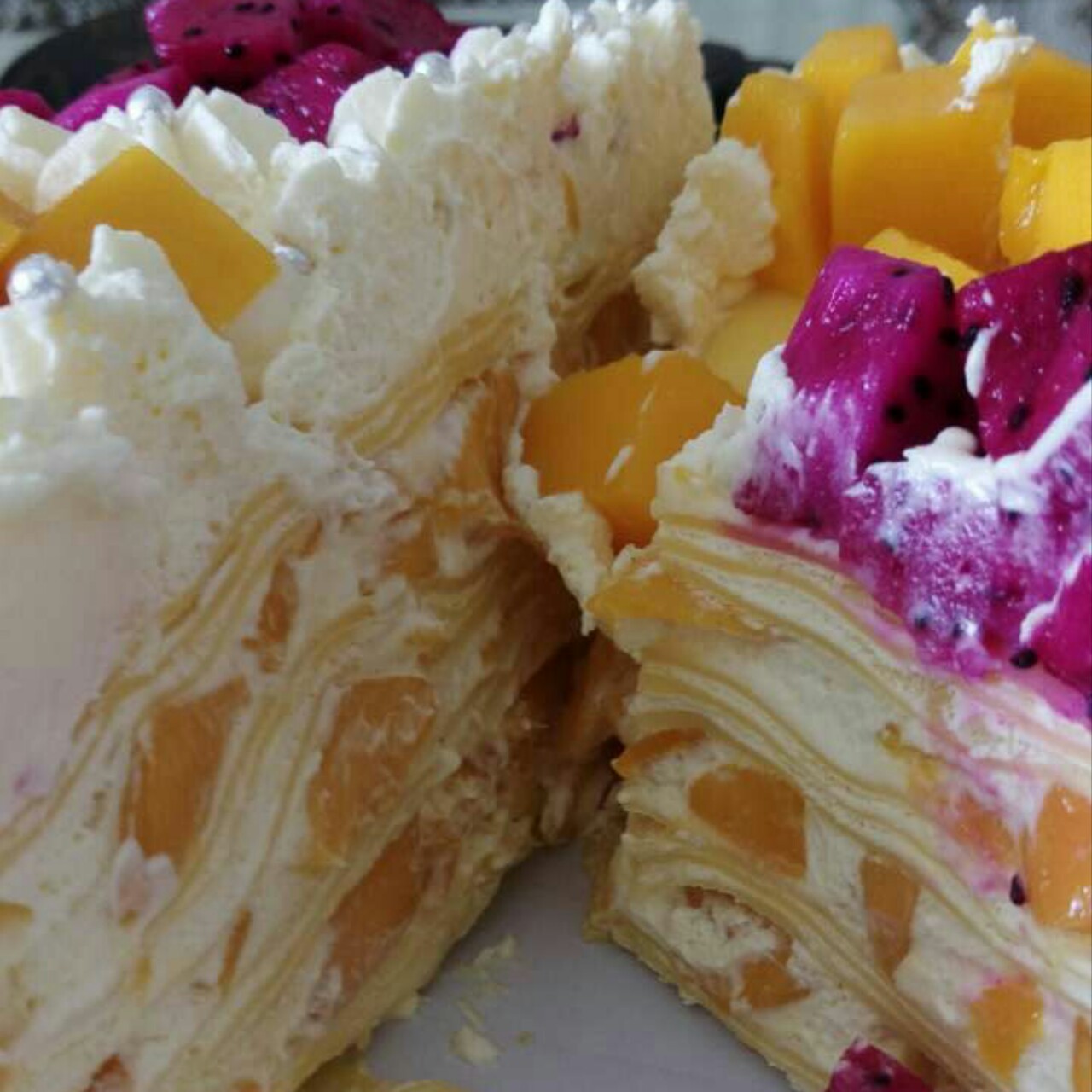 8寸,12张皮,高度6CM,用了800克淡奶油!朋友拍的切面图,水果多多,有木有?