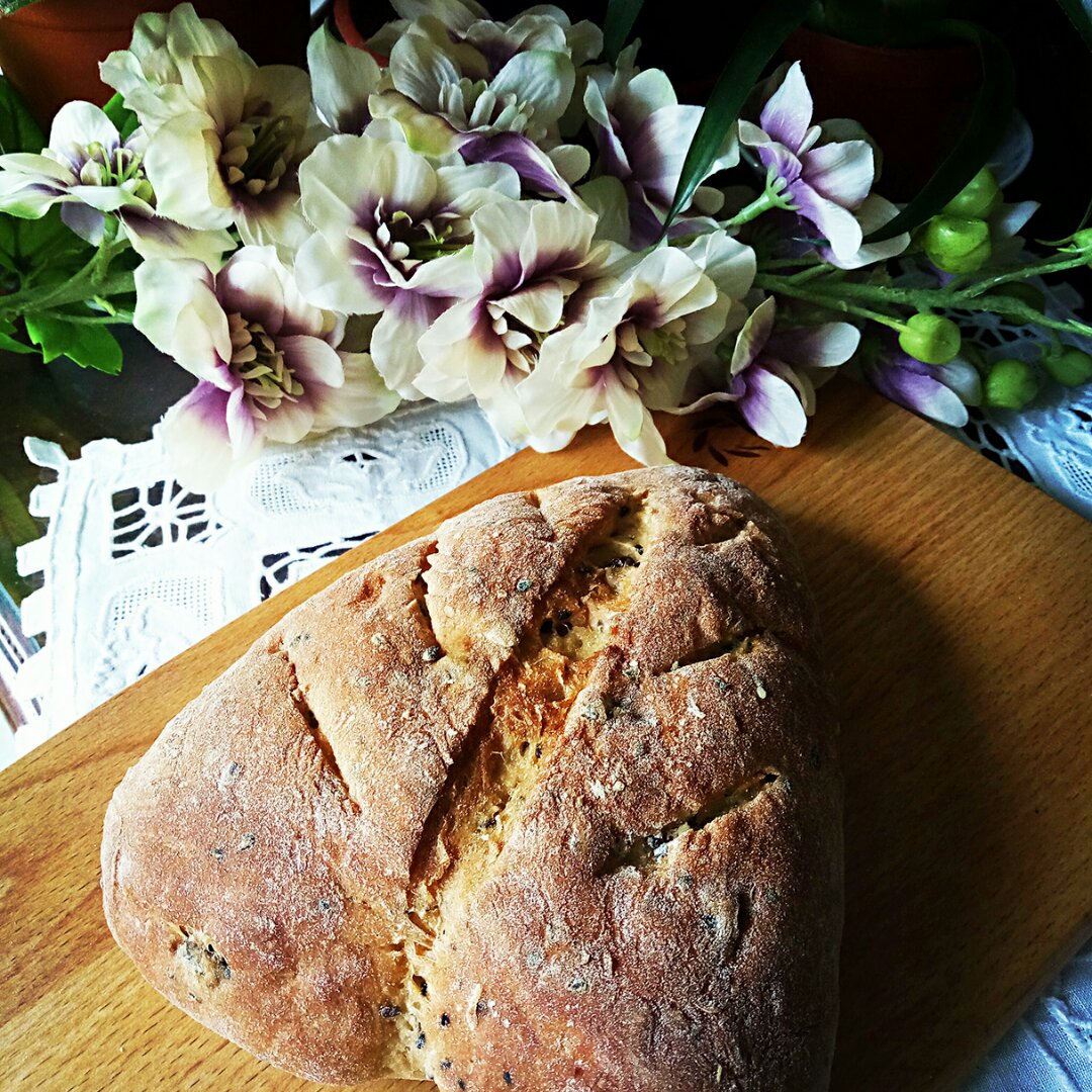 免揉红啤酒黑芝麻黑加仑全麦面包。和三文鱼一天做的,所以我喝的...
