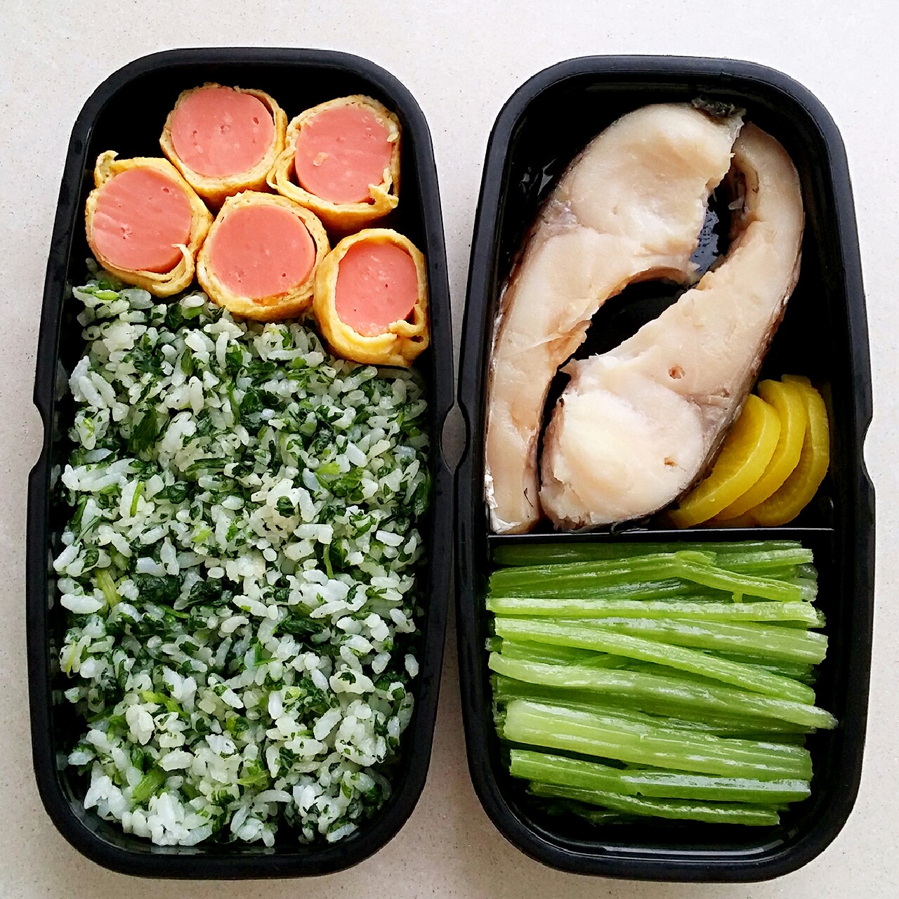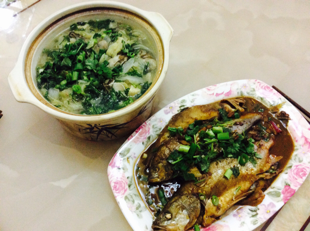 芹菜叶炒饭,火腿肠厚蛋烧,清蒸鱼,炒芹菜