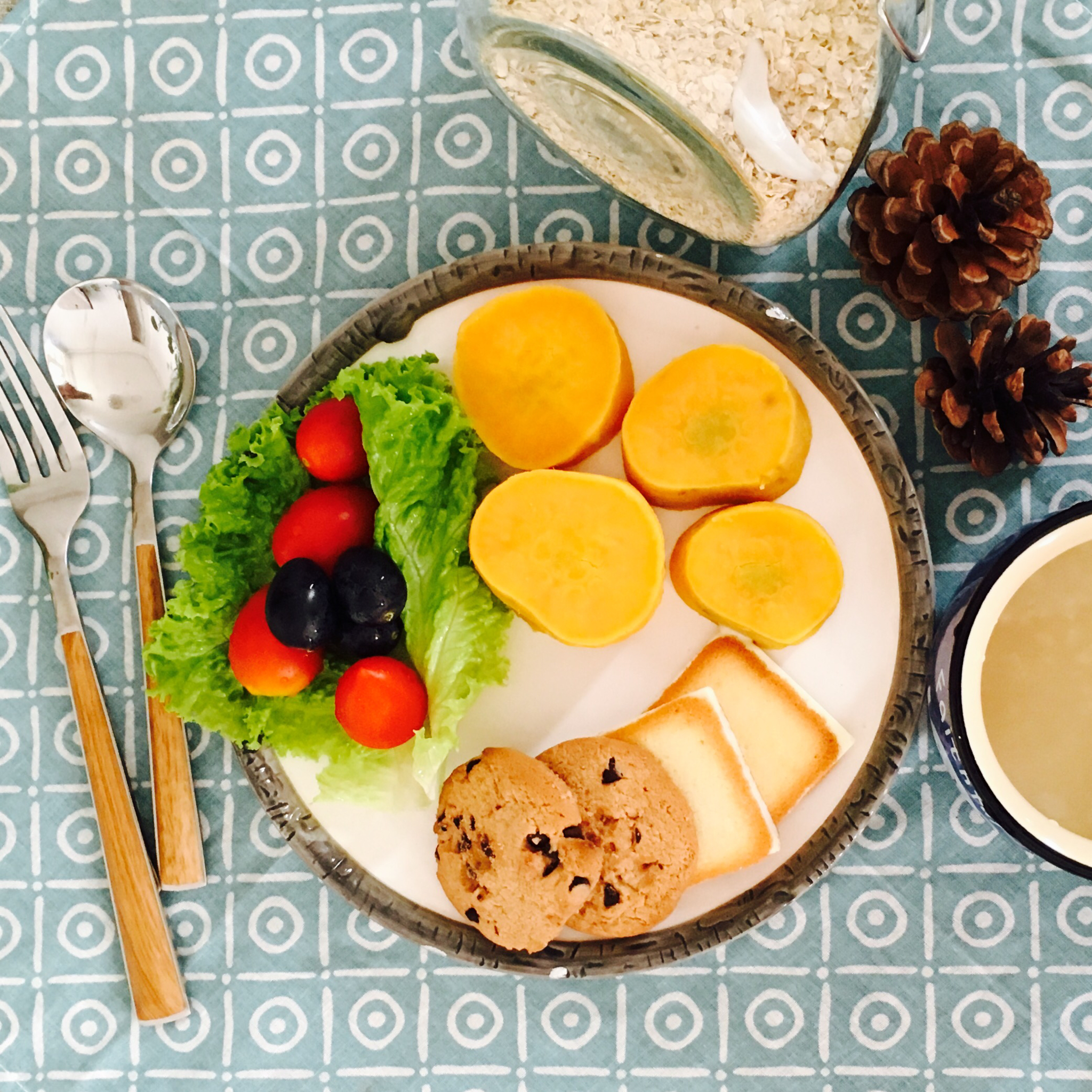 今天是喵爪地瓜,水果蔬菜和饼干,麦片。噢,忘了煎蛋了,let it go。是时候揉个全麦面包啦!