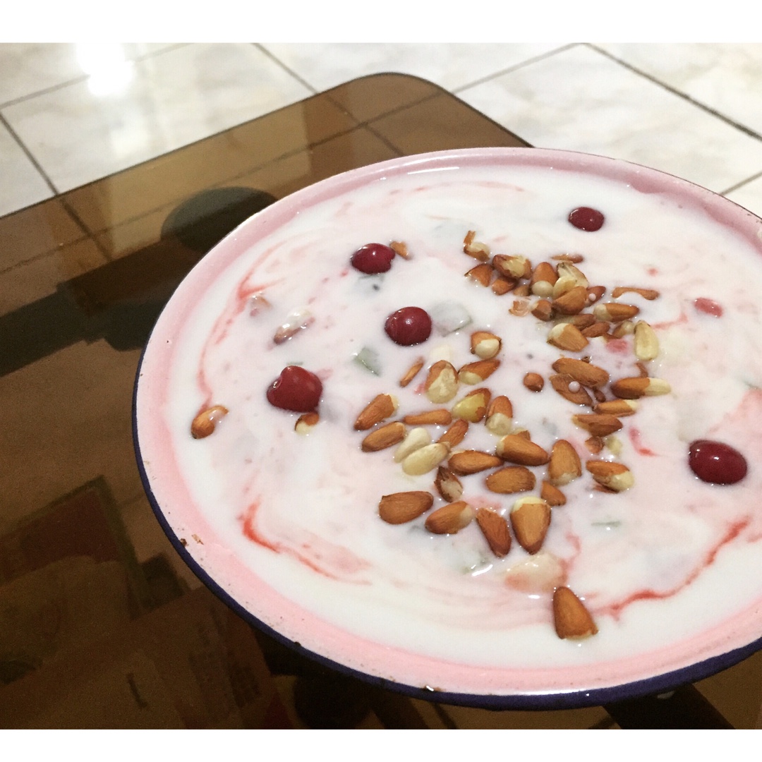 酸奶、樱桃酱、绿豆、樱桃、香蕉、猕猴桃、松子、蜂蜜,