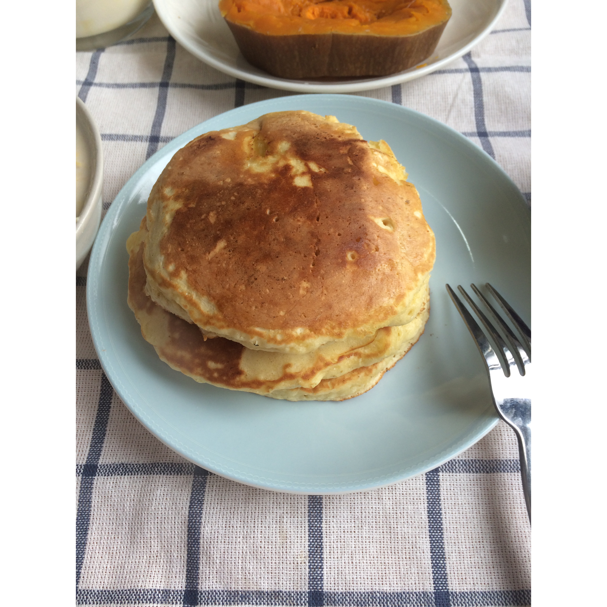 第一次摊松饼,手残党没办法创造颜值-_-#方子的量做了大大三个,抹蓝莓酱吃噜