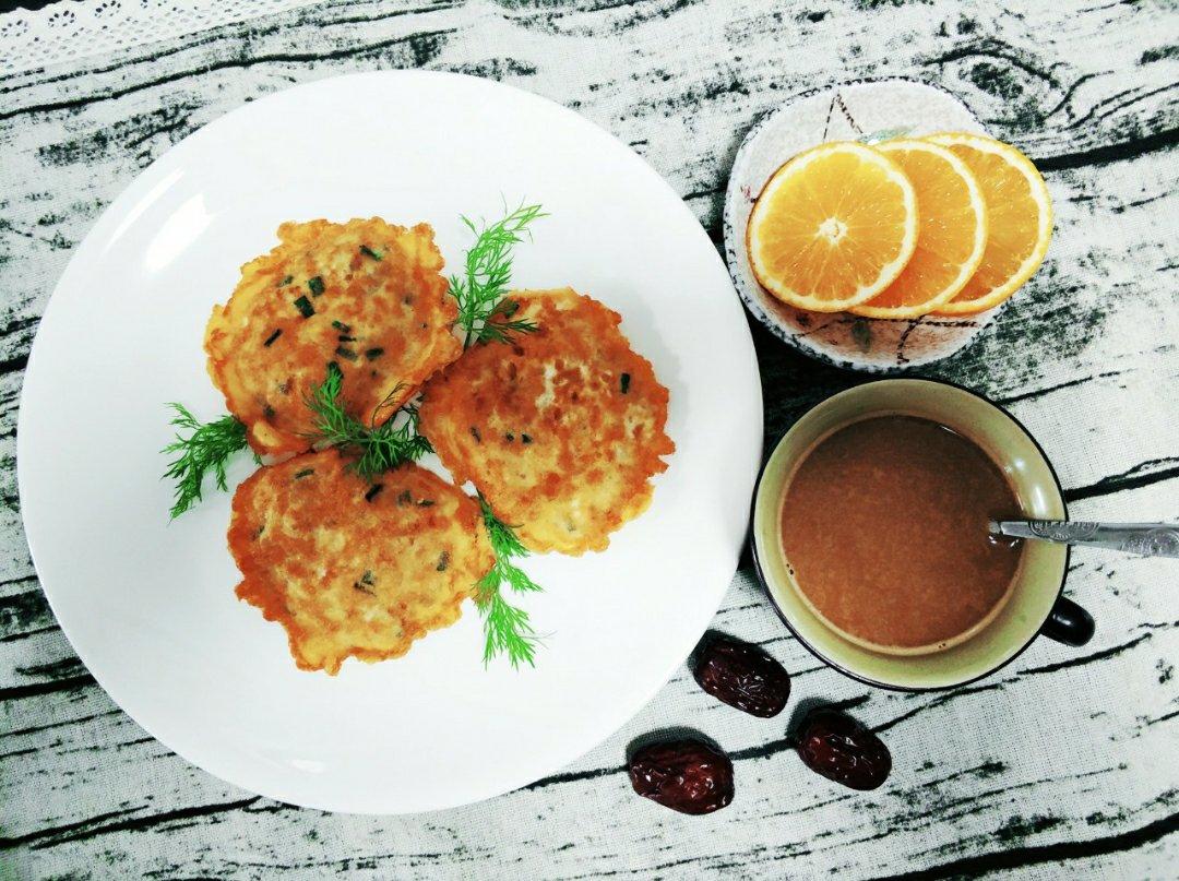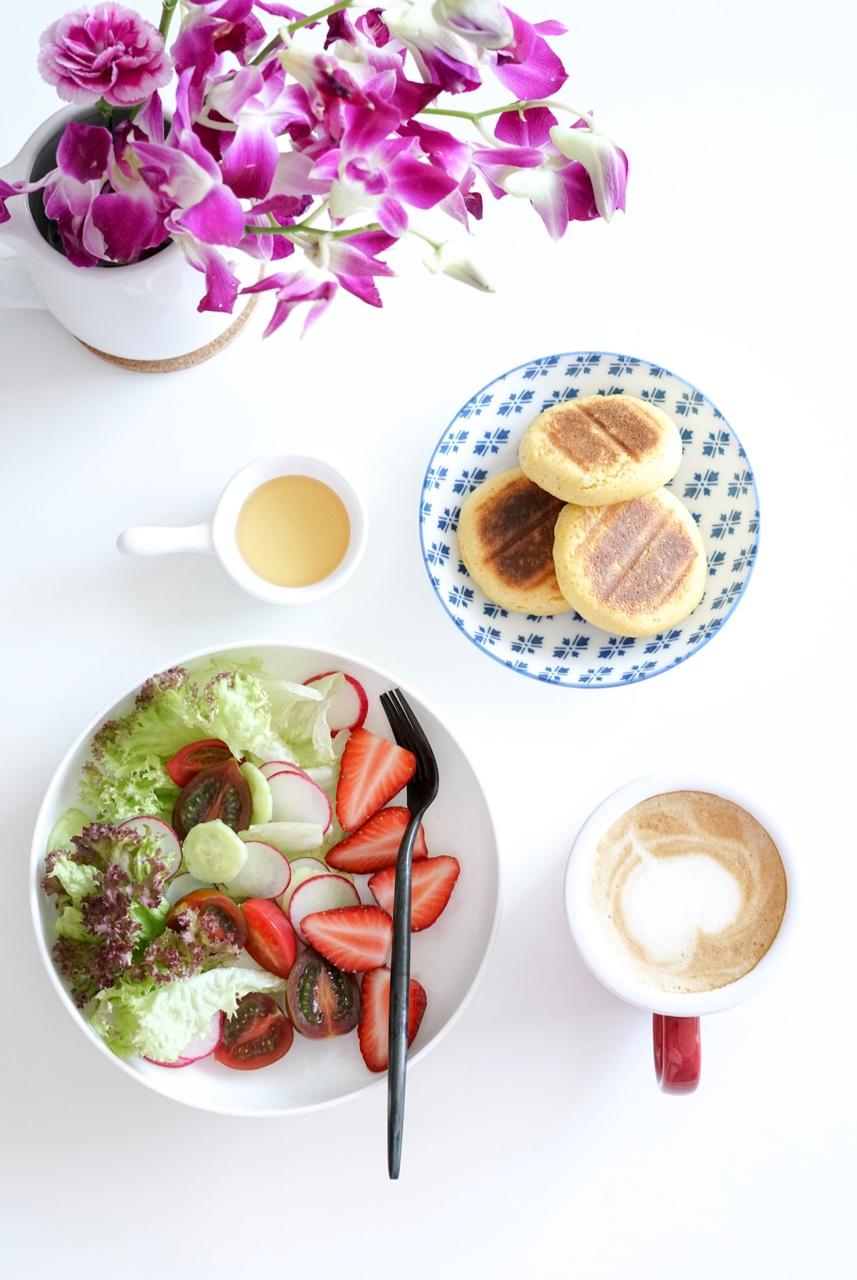 玉米饼&蔬果。奶香玉米饼,忘记调火,没了颜值。