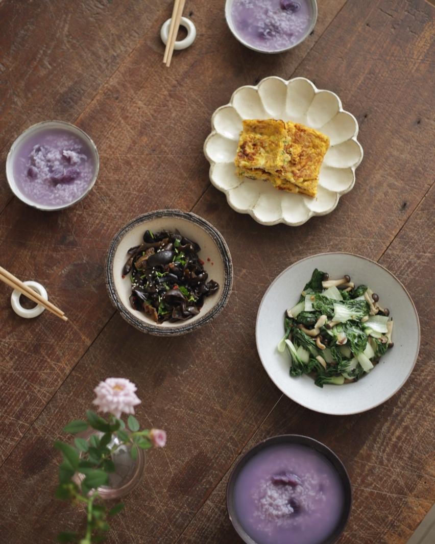 紫薯粥/凉拌木耳/菜脯煎蛋/蟹味菇炒小青菜
