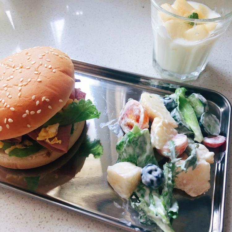 早安呀,今日食🍔、蔬菜杂果沙拉、🍑酸奶~