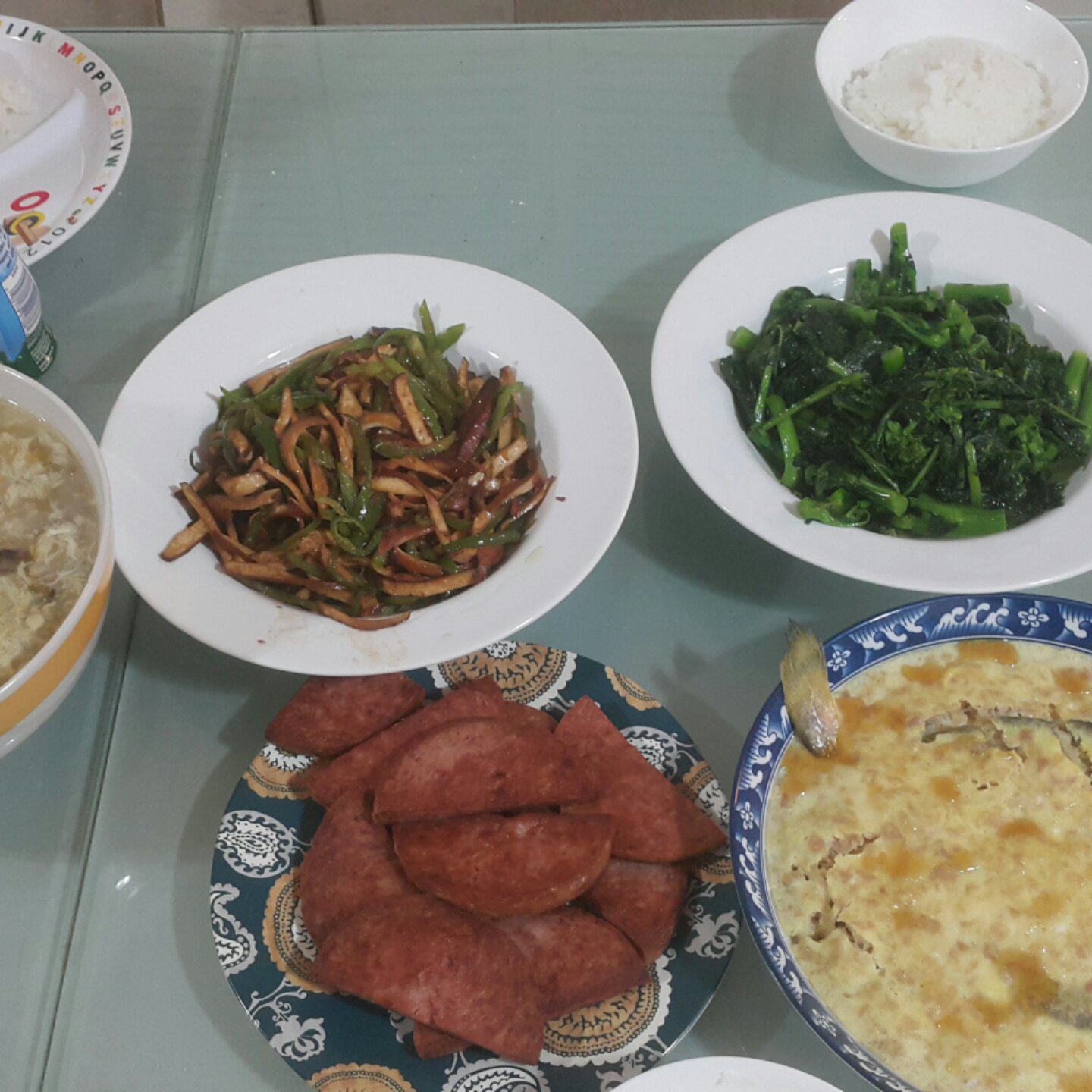 煎午餐肉。青菜。黄鱼鸡蛋蒸肉饼。辣椒豆腐干。努力做饭努力减肥