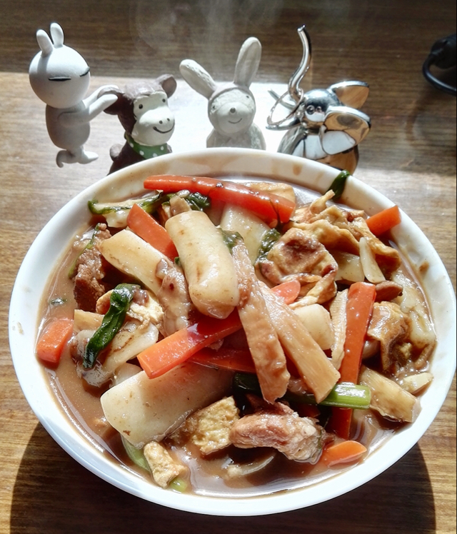 家里没有合用的盘子。我是用烤盘蒸的。老妈做的调料汁很棒。比外面的筋道又干净卫生。