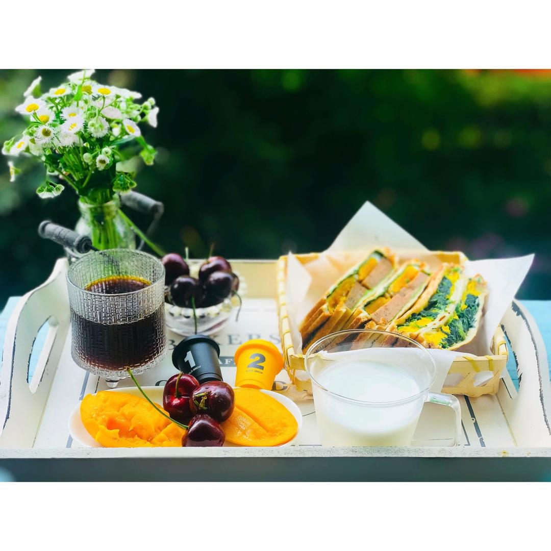 菠菜鸡蛋芝士三明治🥪+午餐肉鸡蛋三明治🥪+水果+咖啡☕️+牛奶咖啡☕️