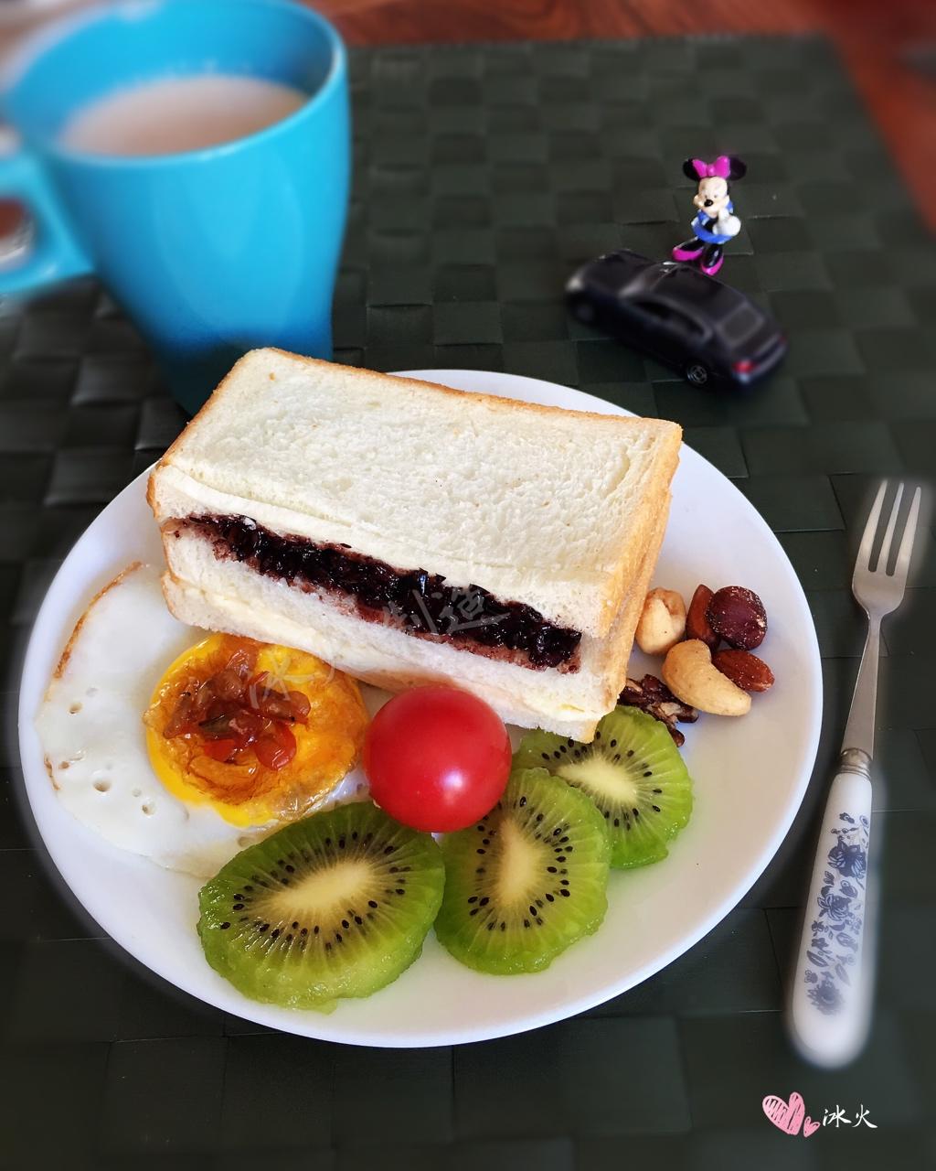 紫米奶酪三明治、奶茶、🦐煎蛋🍳、坚果、🥝圣女果