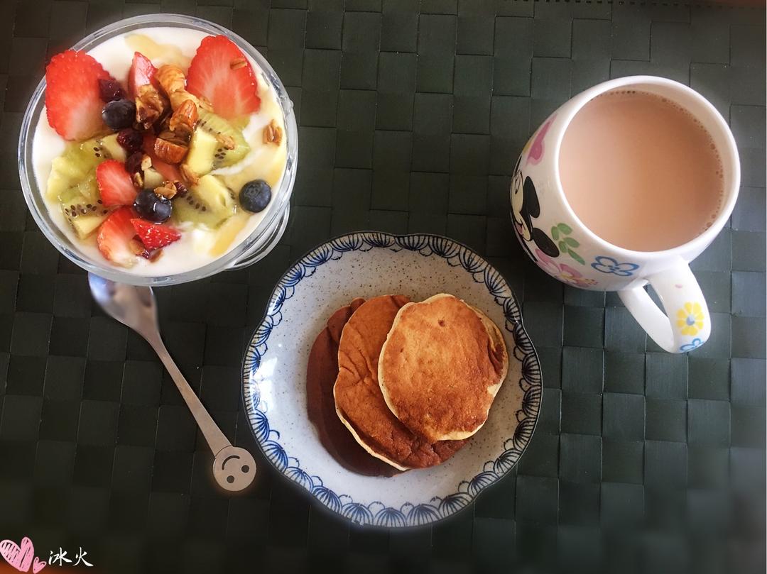 香蕉松饼+酸奶水果捞+普洱奶茶