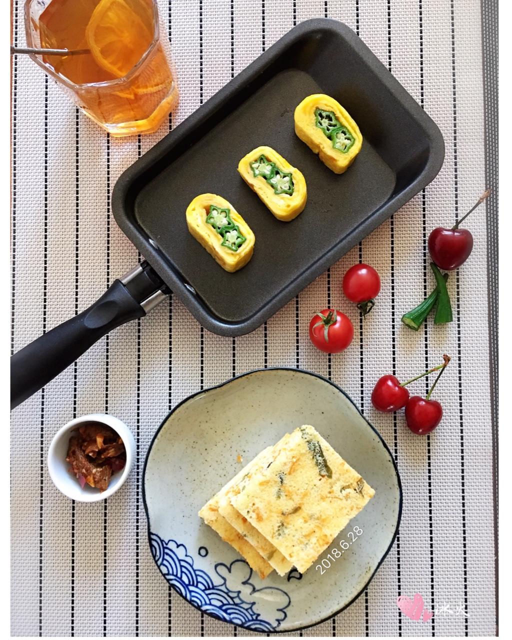 秋葵厚蛋烧、紫菜肉松蛋糕、柠檬膏水、🍒小🍅、牛肉粒