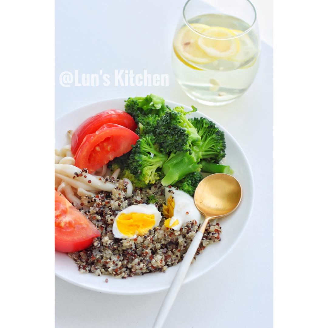 三色藜麦,汆熟西兰花、海味菇和西红柿,外加一个鸡蛋,放丢丢橄榄油和盐。