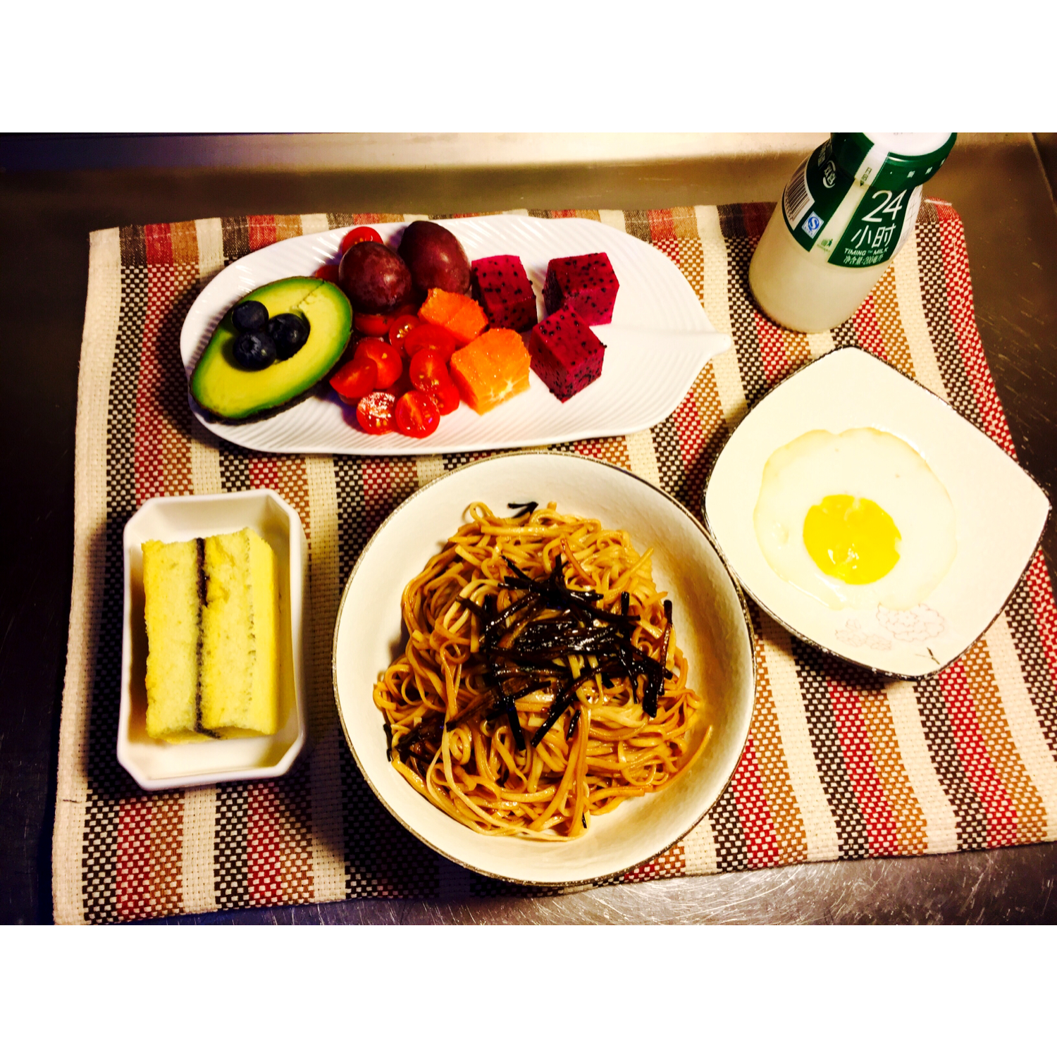 云厨房招牌葱油面&太阳蛋&水果&小蛋糕&牛奶 美好一天从早餐开始😘 女王节快...