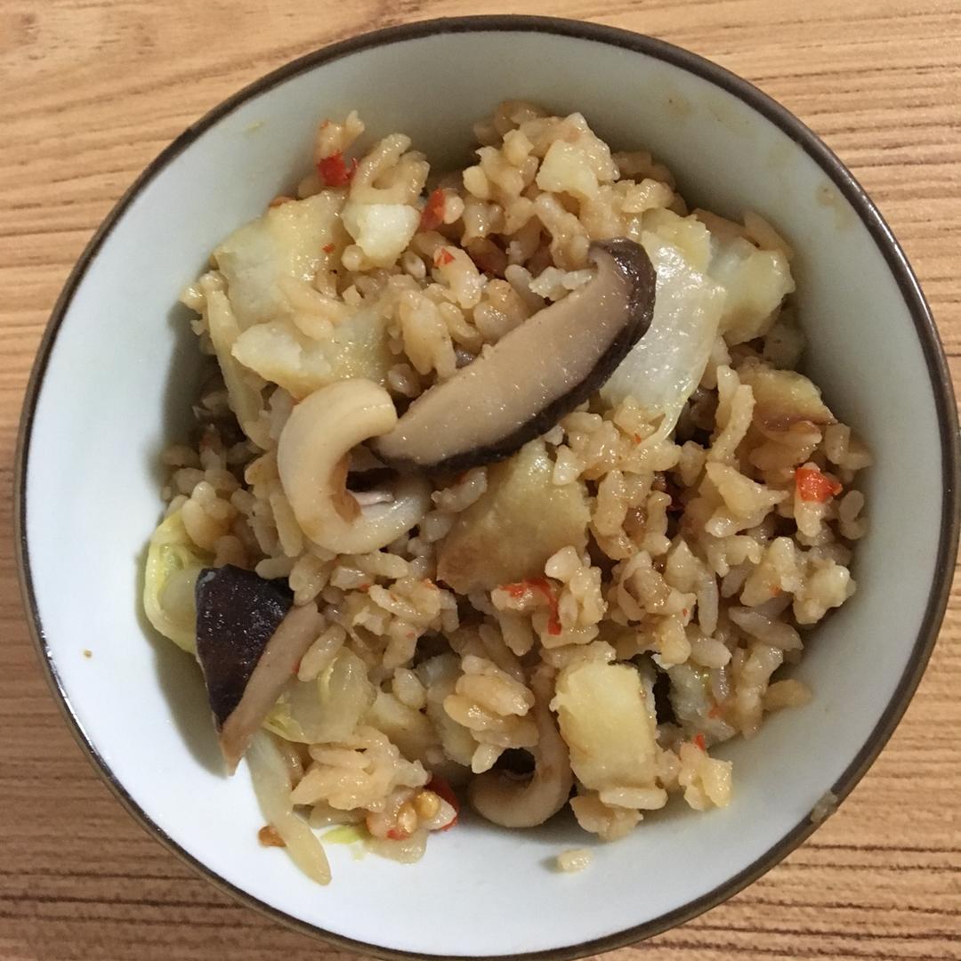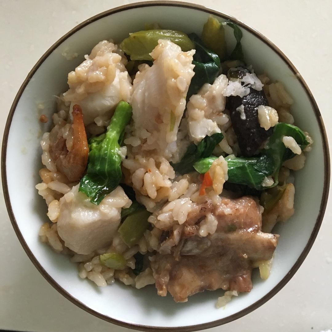 周六午饭,芋头排骨焖饭,还下了点虾仁鱿鱼芥兰香菇花生