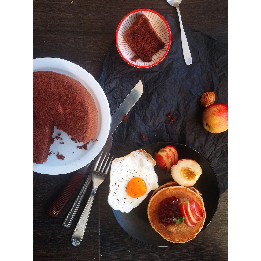 减脂的早安!可可戚风/麦麸无油松饼配大黄酱 草莓酱/溏心蛋/油桃。自己熬的大黄酱好好吃!家里没有一把锋利的刀结果切桃子切...