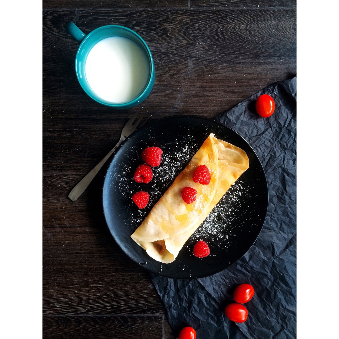 可丽饼配自己熬的大黄酱,蜂蜜和树莓/牛奶