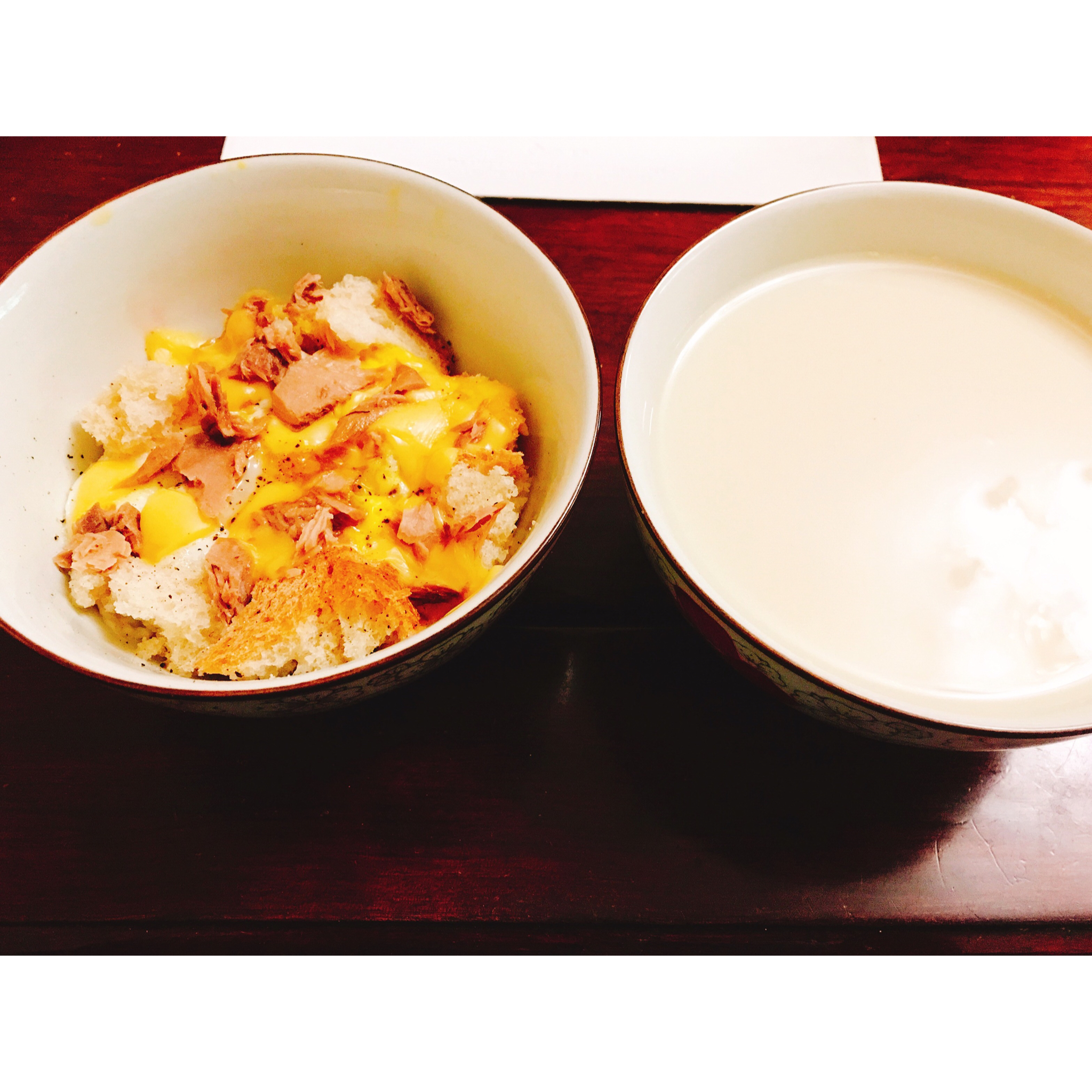 面包拿出来的时候扯坏了,把蛋什么的放进去用微波炉加热,就得到了一碗这样的东西。