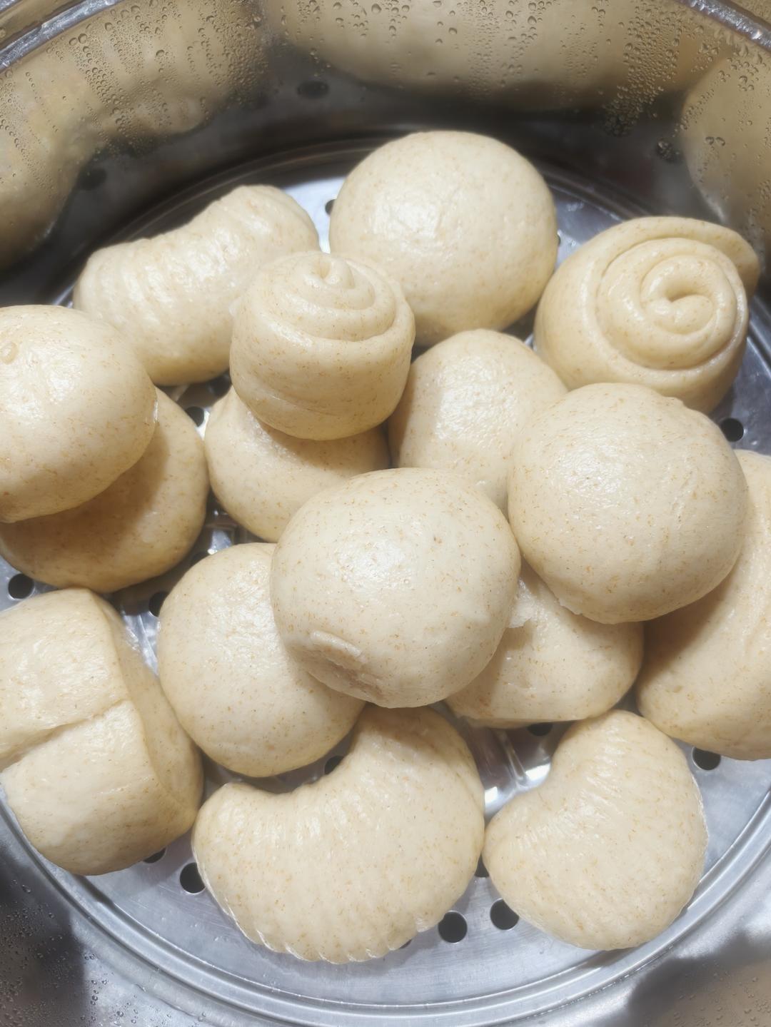 蒸馒头 400g中筋白面粉,100g全麦面粉,温牛奶加酵母5g静置5分钟,面粉倒入牛奶...