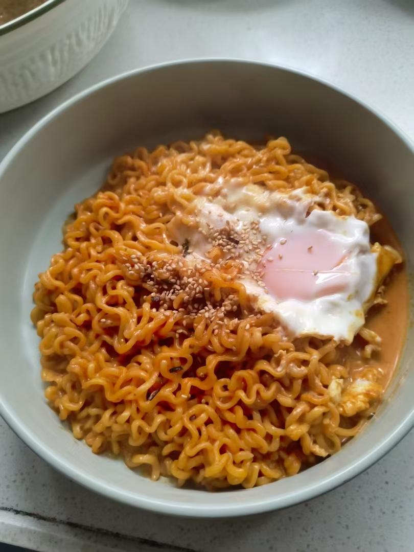 胡萝卜丁超级搭!!!火鸡面加多了加点奶油奶酪就解辣了,还奶香,还可以一边喝牛奶。剪了两条线椒,只是好看,...