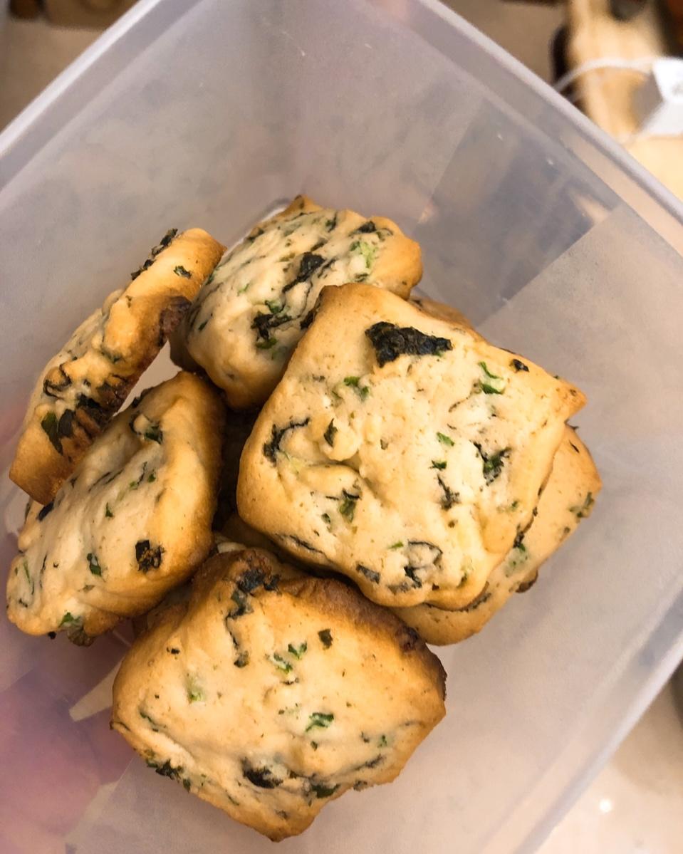 嗯、切的时候有点心急了。妈妈爱吃葱花的、但我觉得海苔在里面好好吃!会再做的饼干!下次整形认真点!