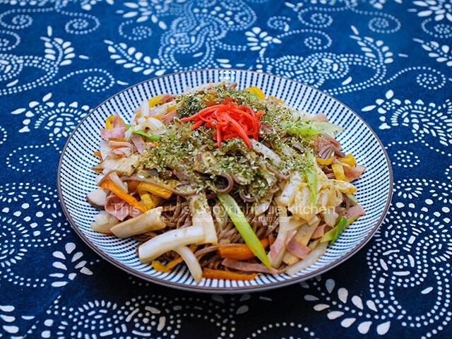 日式炒荞麦面,配菜有白菜、杏鲍菇、彩椒、火腿片、葱段。今天用的是焼そば沙司(市售),不是辣酱油。 #午餐•2017年8月...