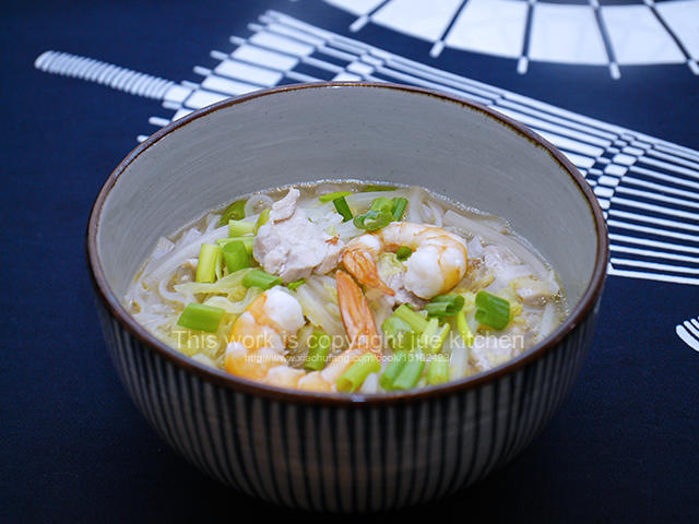 用新买的4mm宽的河粉,以及鸡胸肉和稍大一点的虾,河粉顺滑,汤头鲜美。