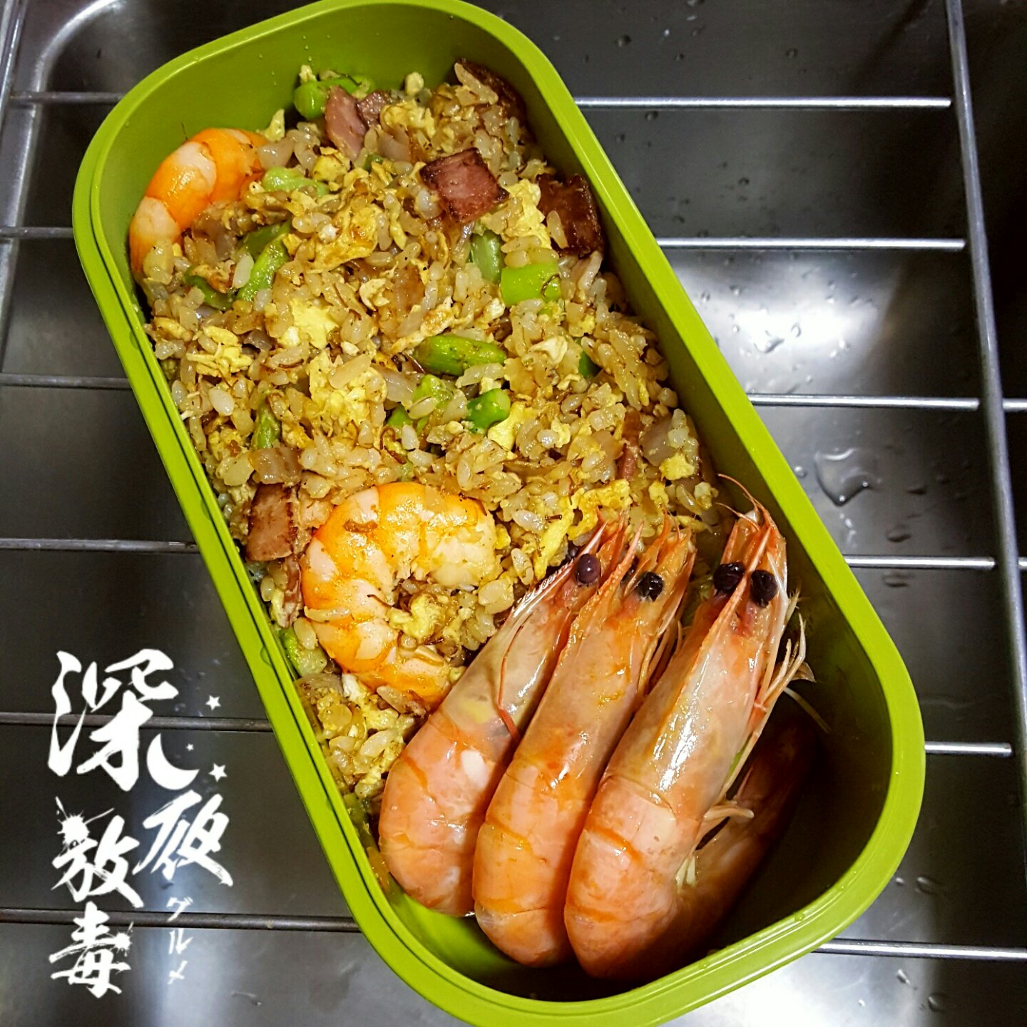 随便炒饭~糙米饭·芦笋·鸡蛋·培根·基围虾·洋葱~冰箱里有的能炒的都放一起炒了~够随便吧
