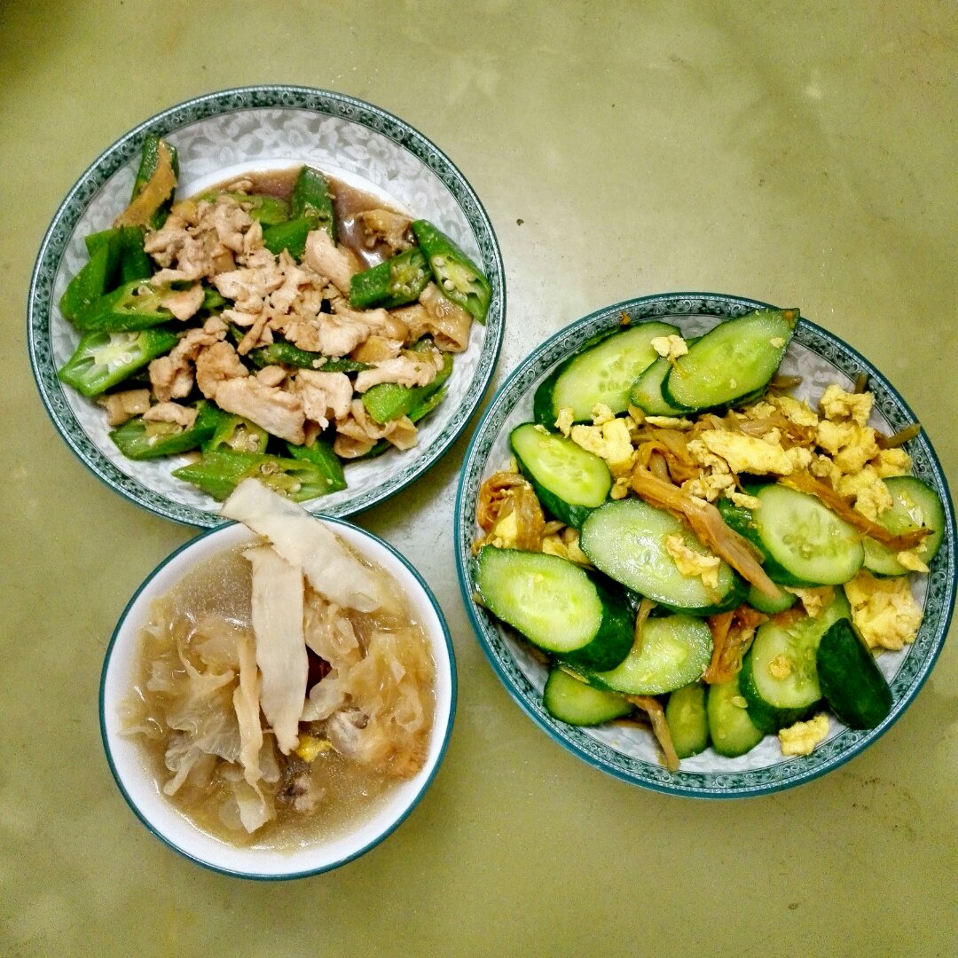 秋葵鸡胸肉,双黄炒蛋,炖鸡汤