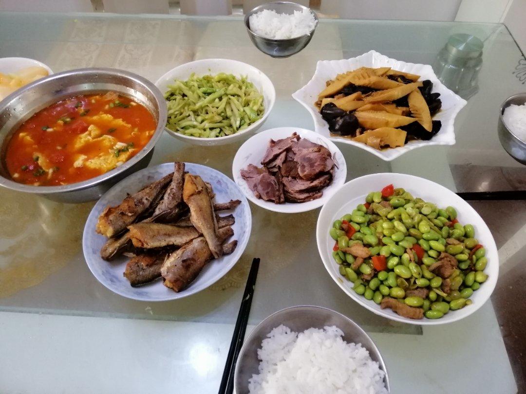 茄汁虾,炸小黄鱼,拌黄瓜,银鱼炒蛋,豌豆肉丁,香菇青菜,筒骨木耳汤