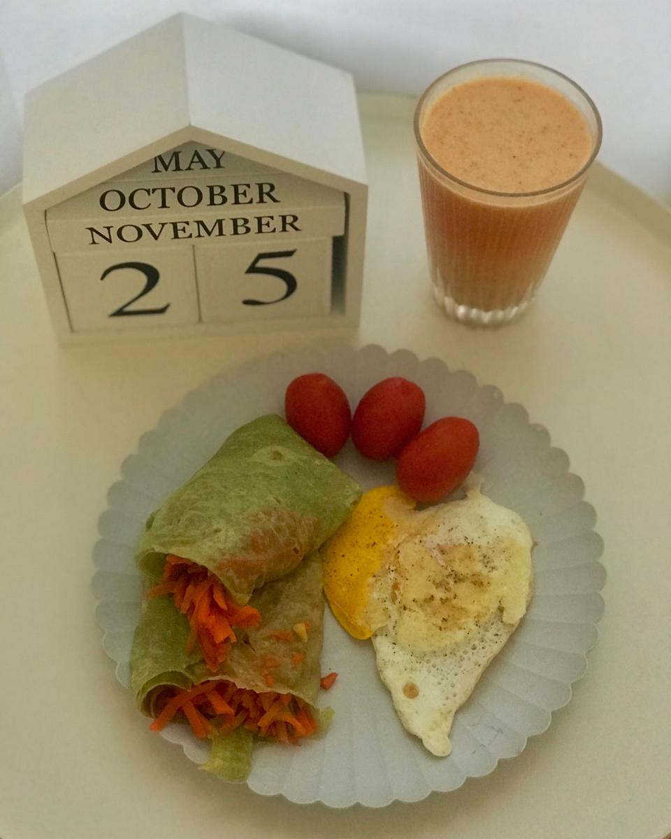 胡萝卜🥕卷饼、煎蛋🍳、圣女果、枸杞豆浆