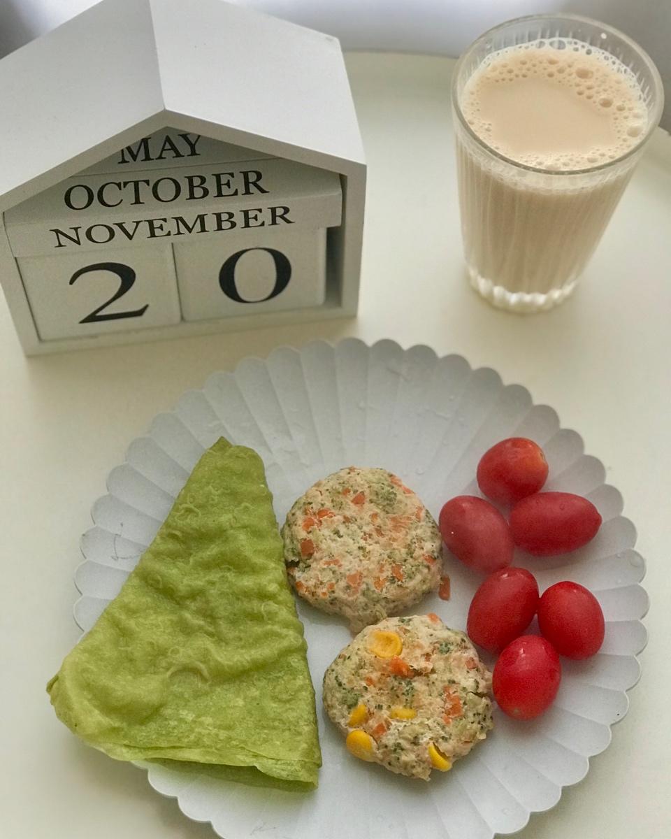 菠菜卷饼、鸡胸肉饼、圣女果、苹果味旺仔牛奶