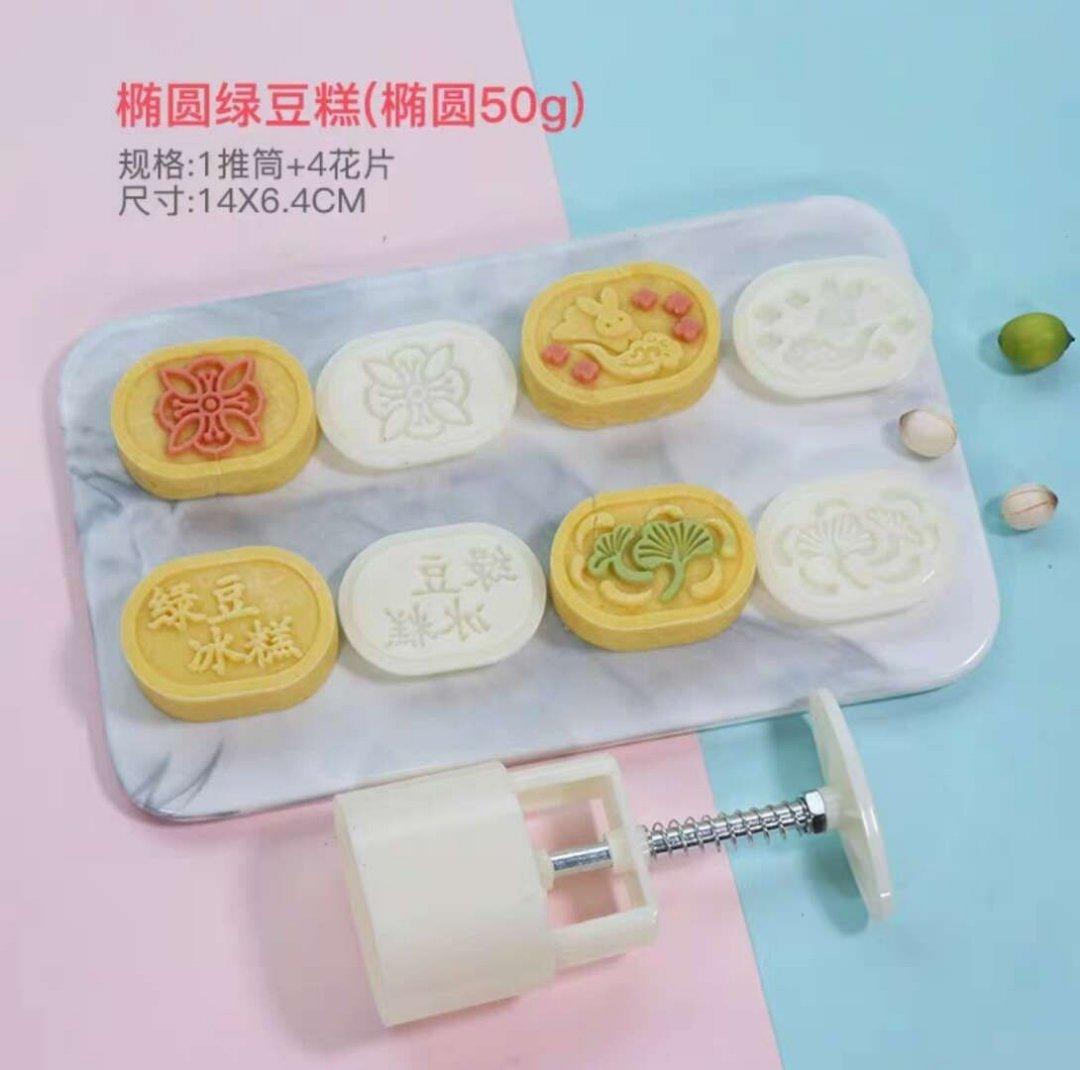 1. 50克4花片椭圆形绿豆糕模具(线条花朵,小兔扑草,绿豆冰糕,草叶)