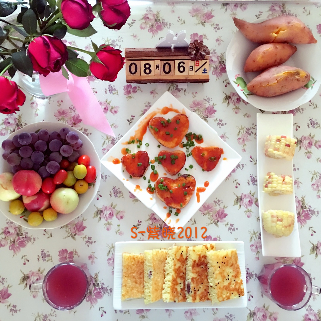 #小米面豆糕➕玉米➕红薯➕番茄豆腐➕水果➕葡萄汁#
