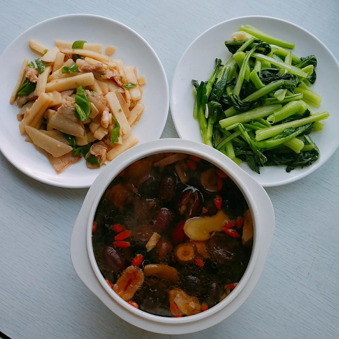 周末的午餐,老母鸡汤,白薯炒肉,青菜