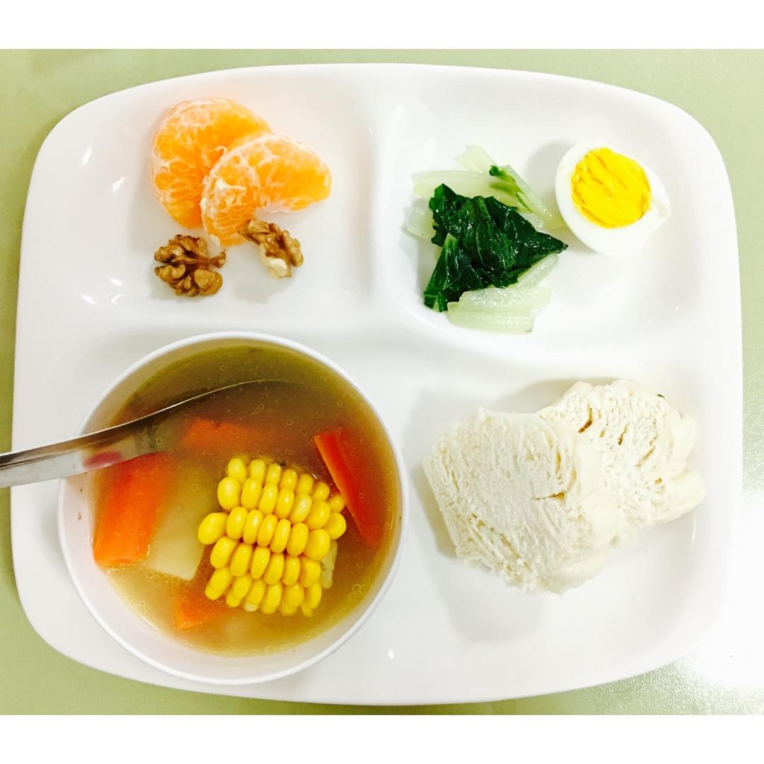 早安!胡萝卜玉米汤➕花卷➕水煮蛋➕水果➕核桃