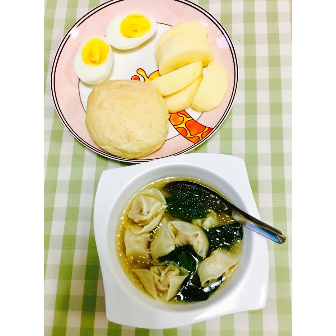 早安!今天期末考试啦,小妞昨晚竟然失眠😂早餐吃云吞,无糖无油的胡萝卜面包!