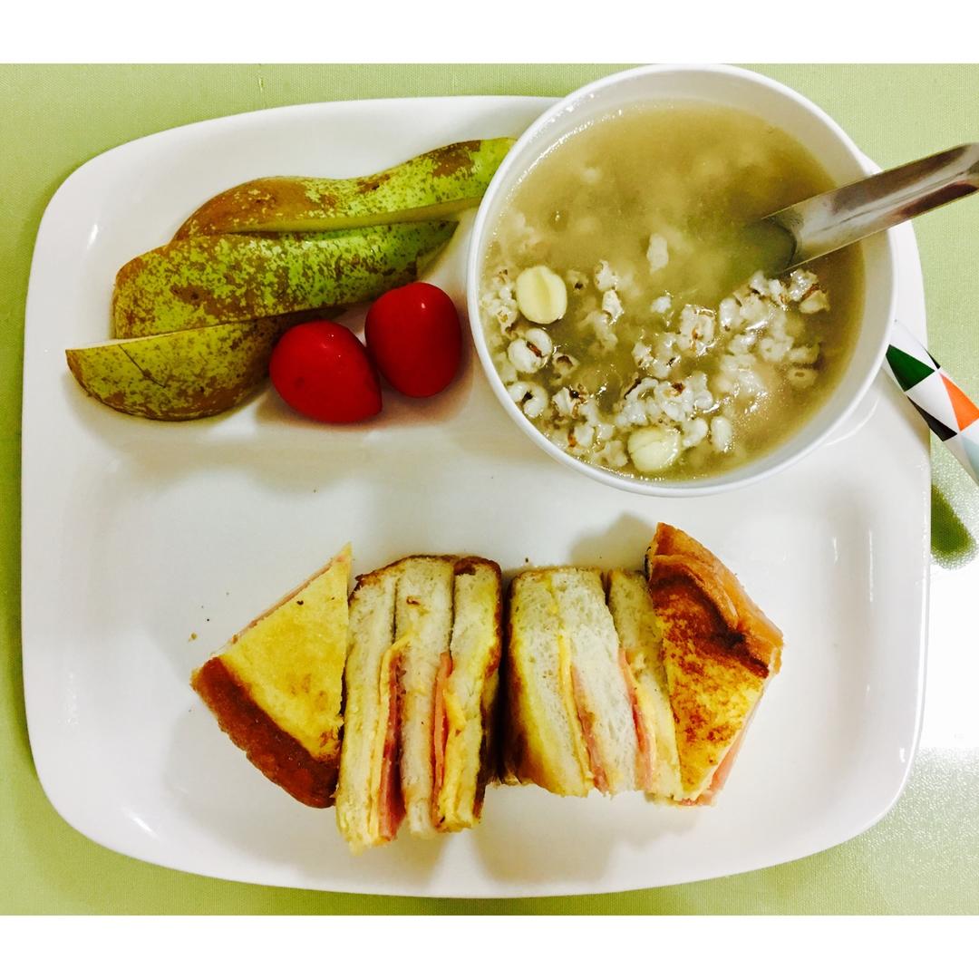 早安!雪耳薏米莲子汤➕西多士➕啤梨➕樱桃番茄。