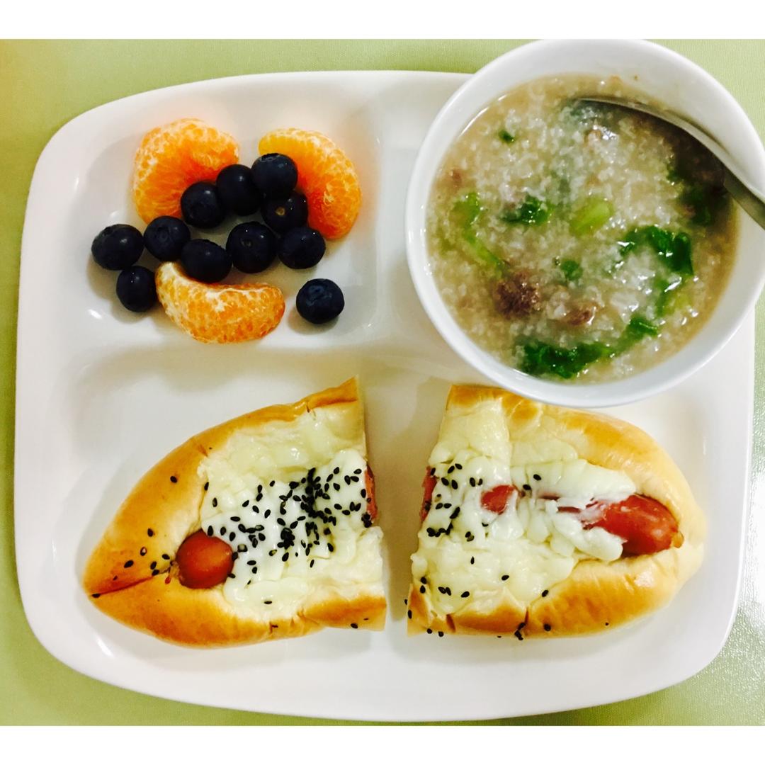 早安!今天吃生菜牛肉粥➕火腿肠面包➕蓝莓➕丑柑(^_^)