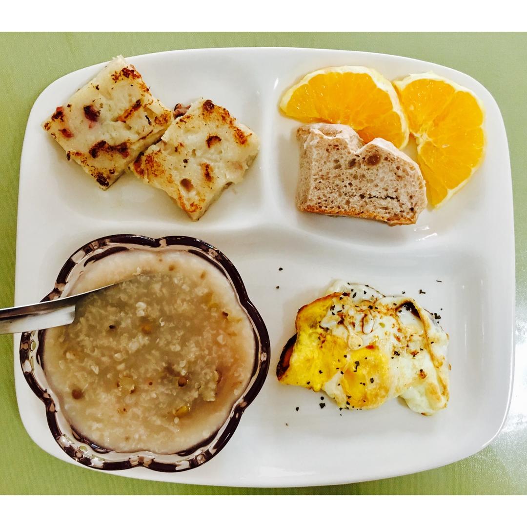 早安!腊味萝卜糕➕罗勒煎蛋➕红糖面包➕绿豆粥➕甜橙,吃完早餐出门上钢琴课,接着上羽毛球课~ #早餐•2017年2月18日...