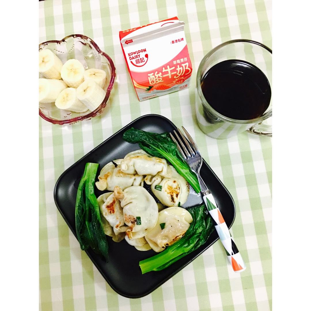 早安!今天吃煎饺、罗汉果茶➕酸奶,顺手烫了几根青菜。餐桌稀客香蕉是邻居奶奶送的,爸爸帮她修洗衣机了(^_^) #早餐•2...