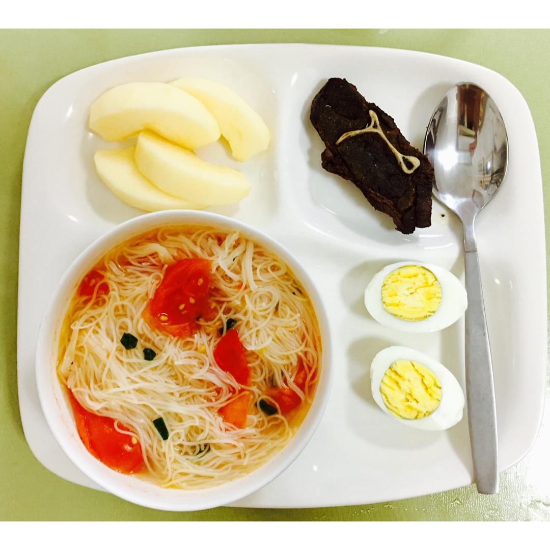 早安!酸汤米粉➕烤羊腿➕水煮蛋➕苹果,周末到啦✌🏻✌🏻✌🏻