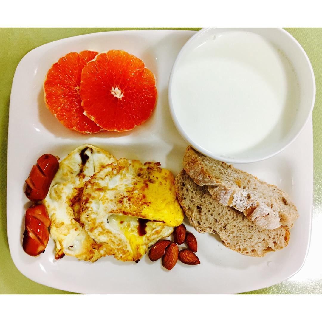 早安!新学期开始喽,继续加油(^_^)昨天做好的果干面包,配酱油蛋、红橙、热牛奶~