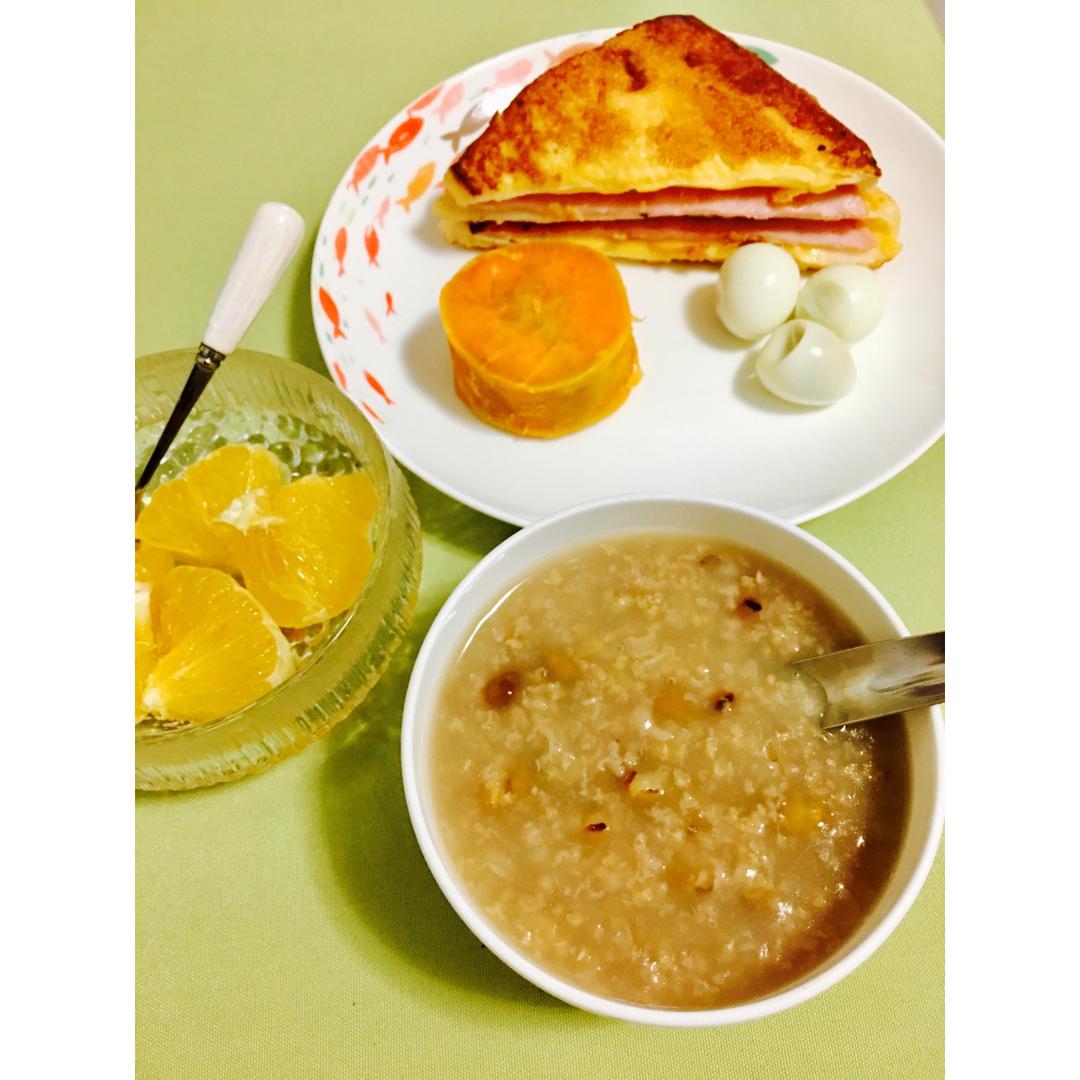 早安!今天吃双米绿豆粥,搭配西多士,还有红薯、鹌鹑蛋跟水果(^_^)