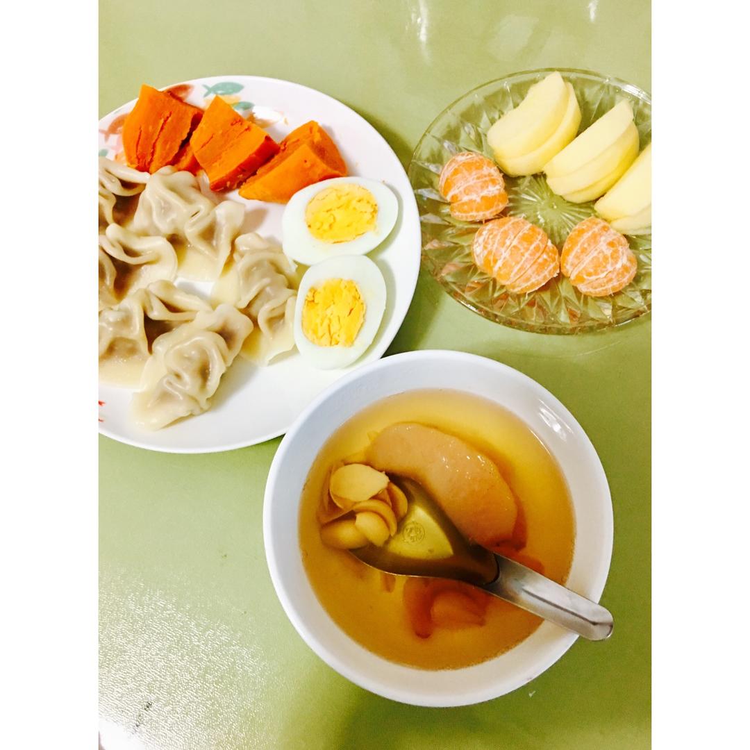 早安!今天早餐吃冰糖雪梨百合汤、饺子、水煮蛋、蒸红薯,水果~