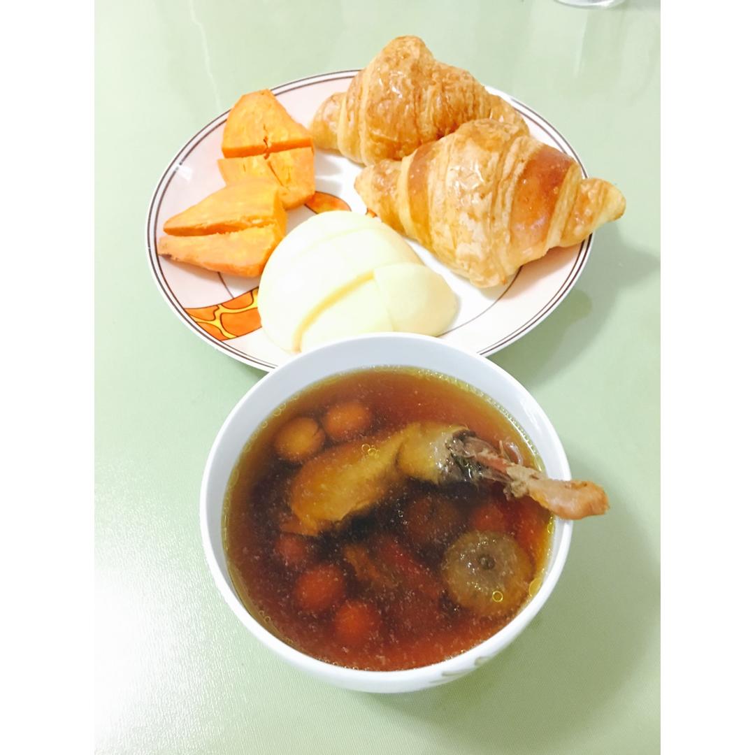 早安!今天早餐有无花果莲子炖鹧鸪:牛角包、红薯跟苹果,天冷多喝汤(^_^)
