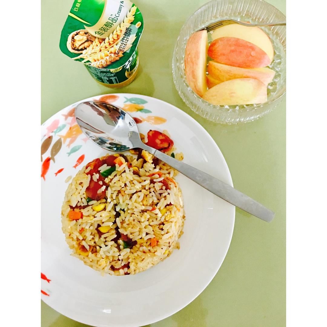 早安!腊肠杂菜蛋炒饭、酸奶&水果(^_^)